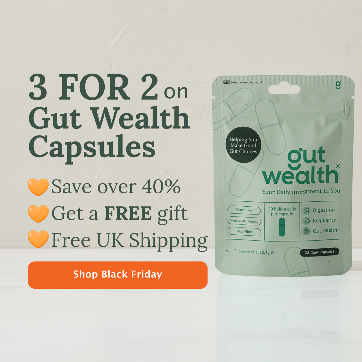 They’re gluten free and vegetarian friendly - but not suitable for vegans, as they contain a dairy-derived postbiotic (good bacteria developed using milk).